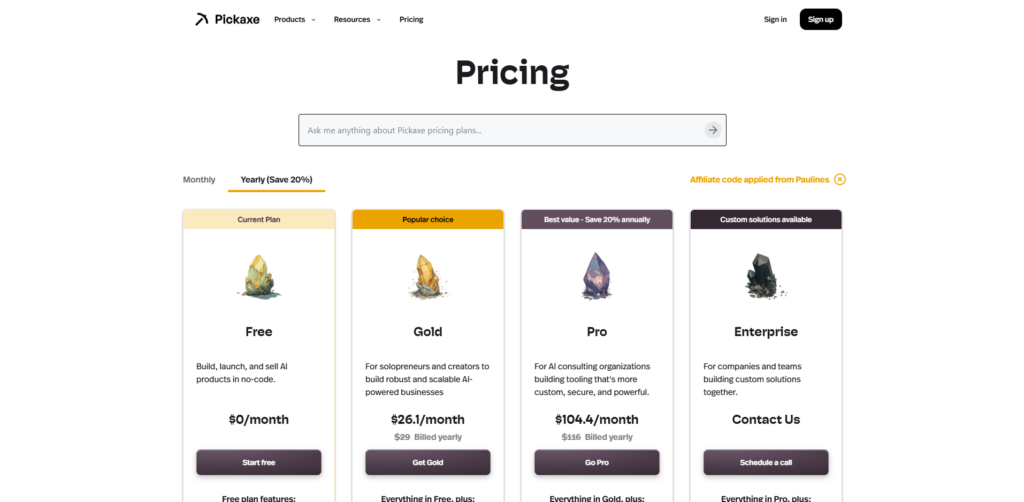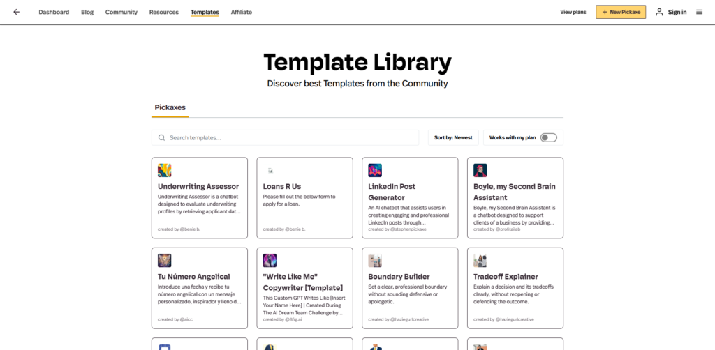 What truly sets Pickaxe apart from other custom GPT builders is its heavy focus on monetization and deployment. It does not just help you build an AI tool; it provides you with a fully white-labeled “Studio” where users can log in, subscribe to a payment plan, and use your tools. By giving you the infrastructure to monetize AI agents instantly via Stripe, it effectively turns any niche expertise into a scalable software-as-a-service (SaaS) business.